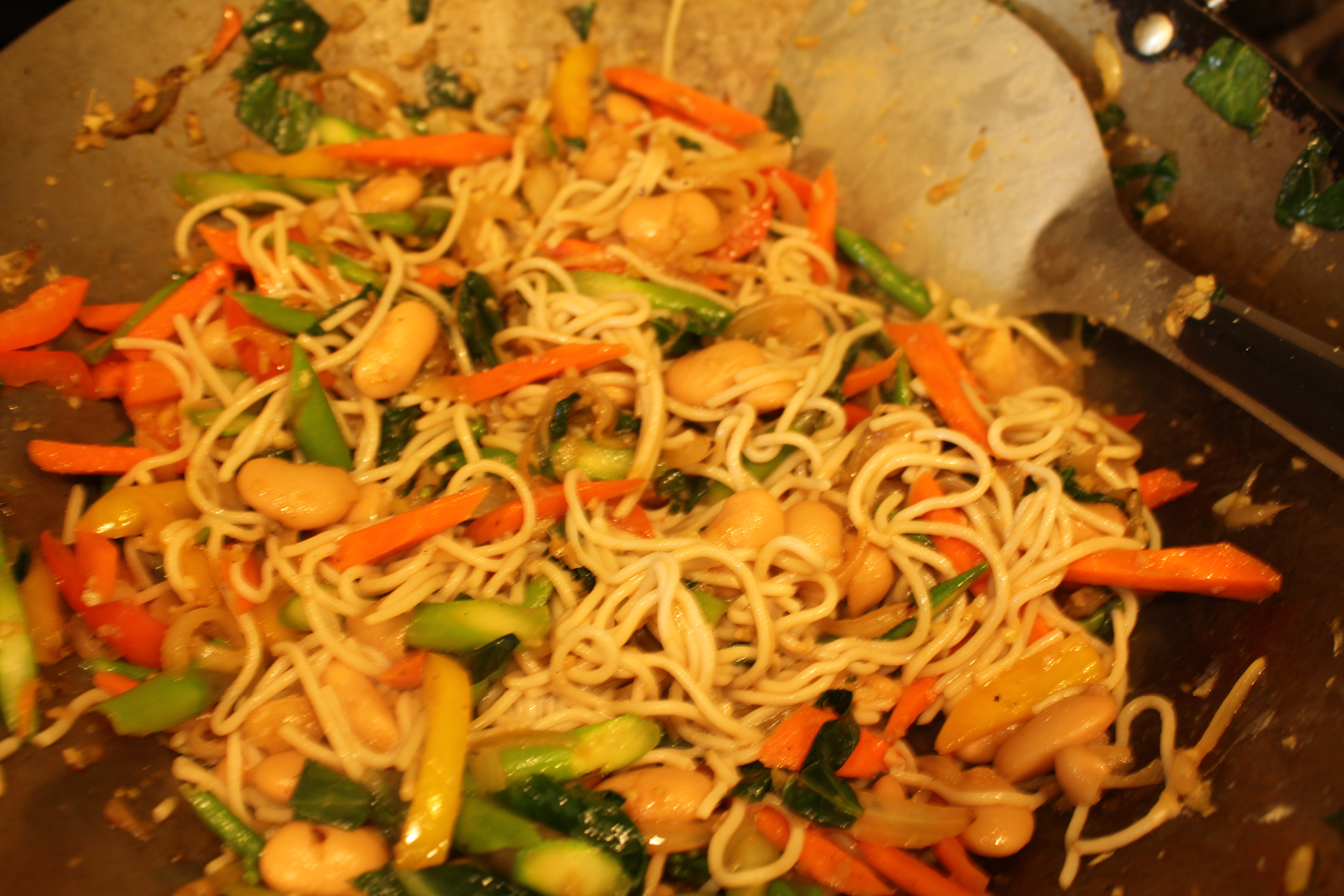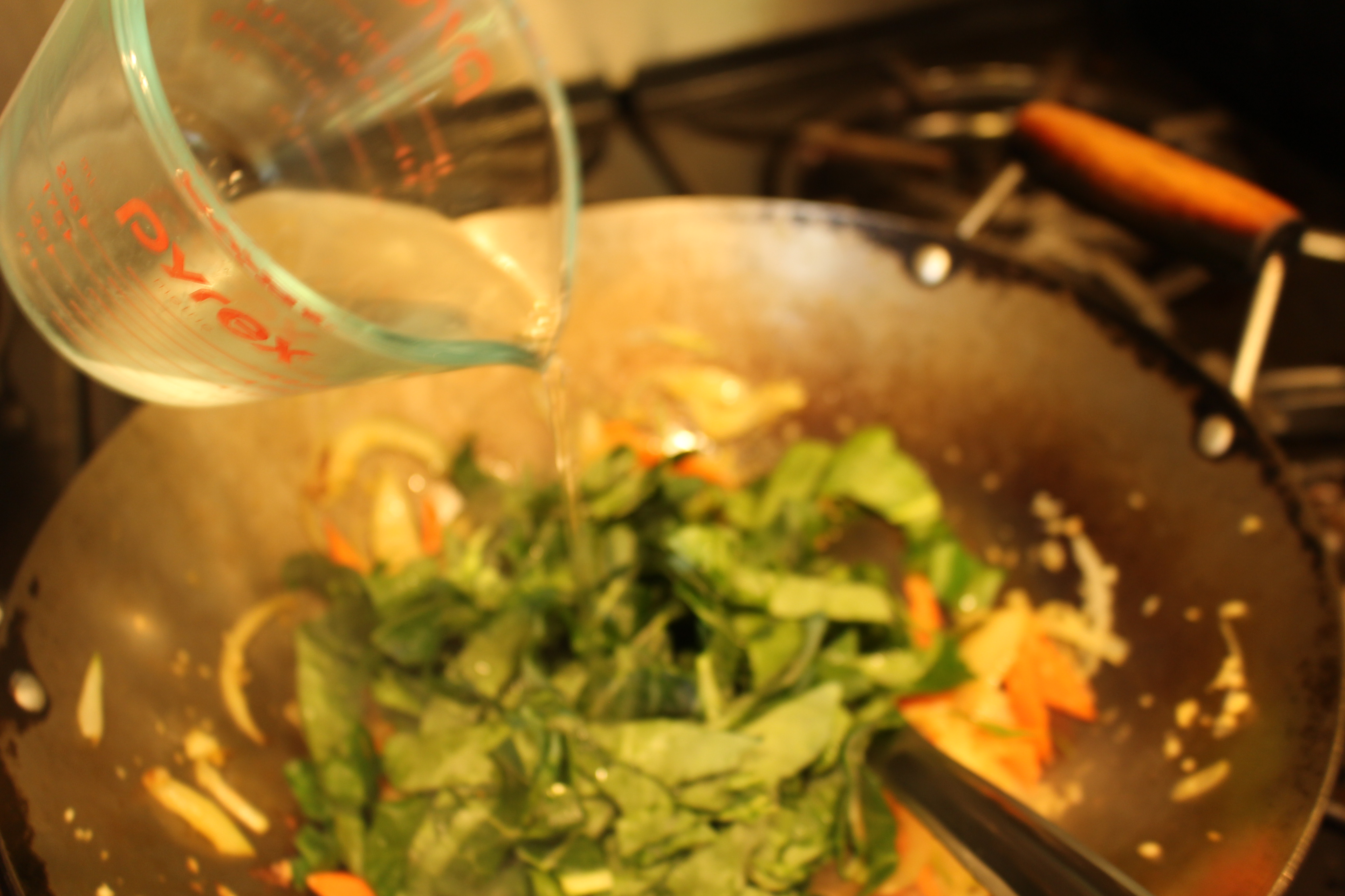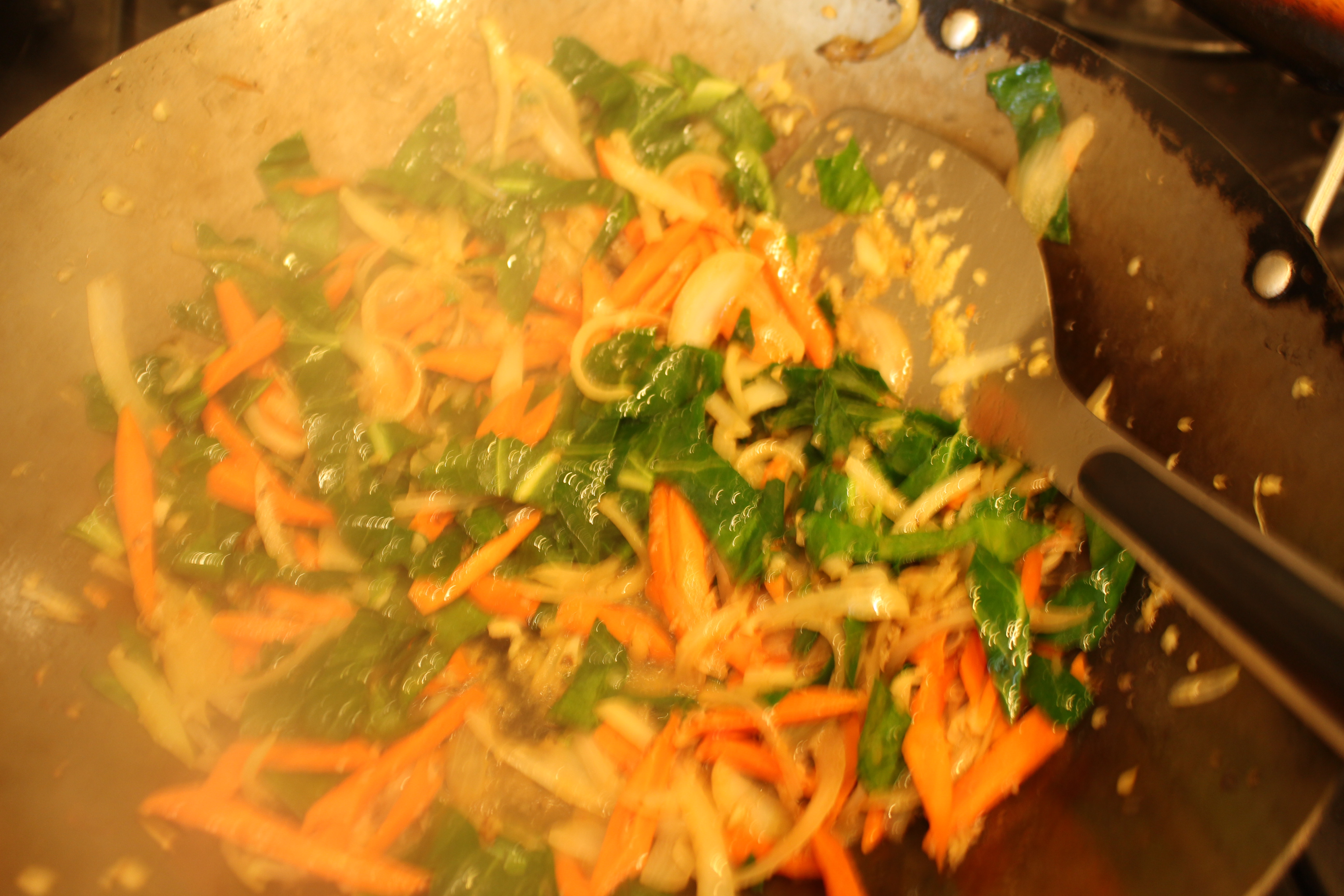 1. Chop up collard greens, carrots, onions, & peppers. In a wok or large sauté pan, sauté onions in the olive oil for 5 minutes. Add the ginger and garlic.