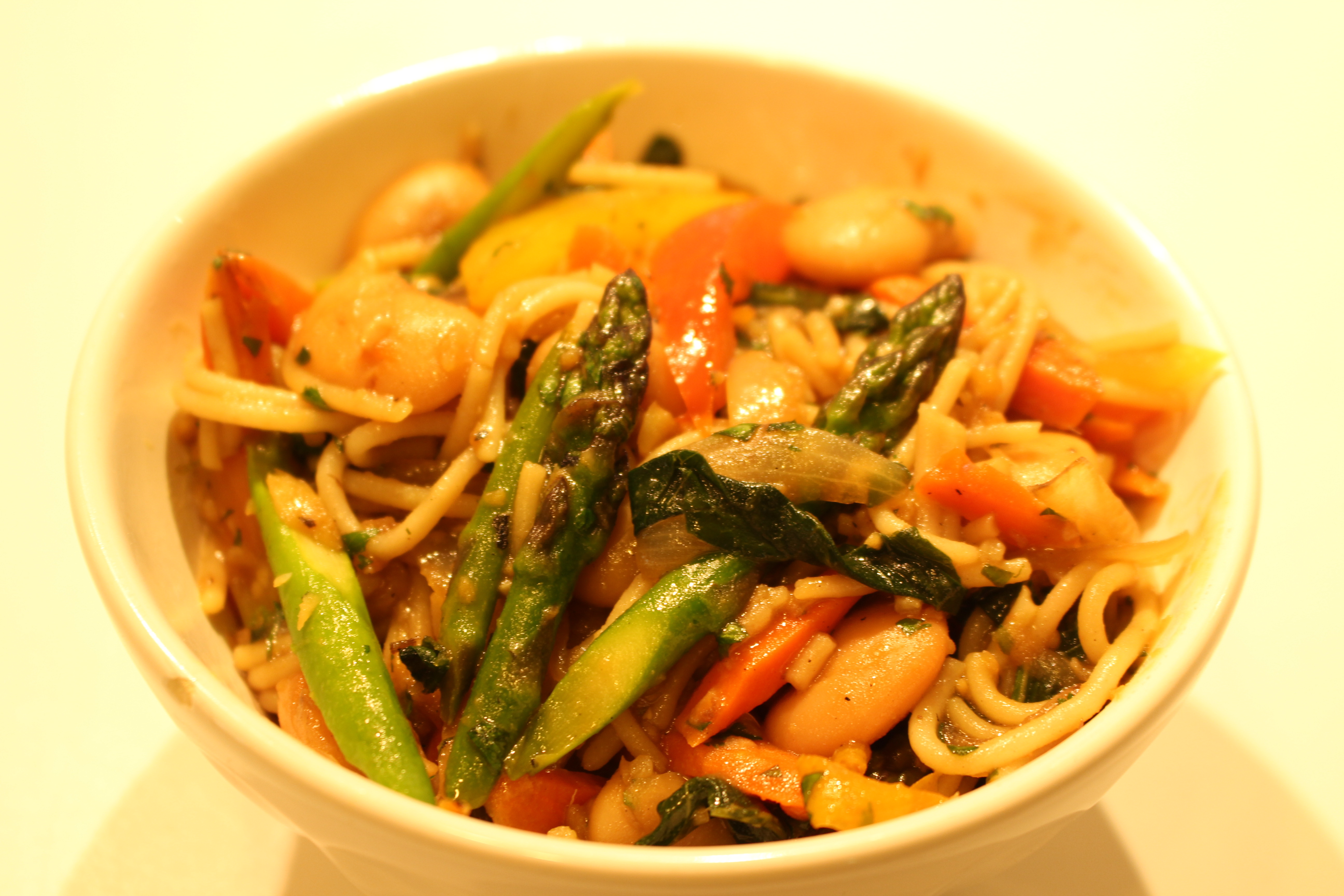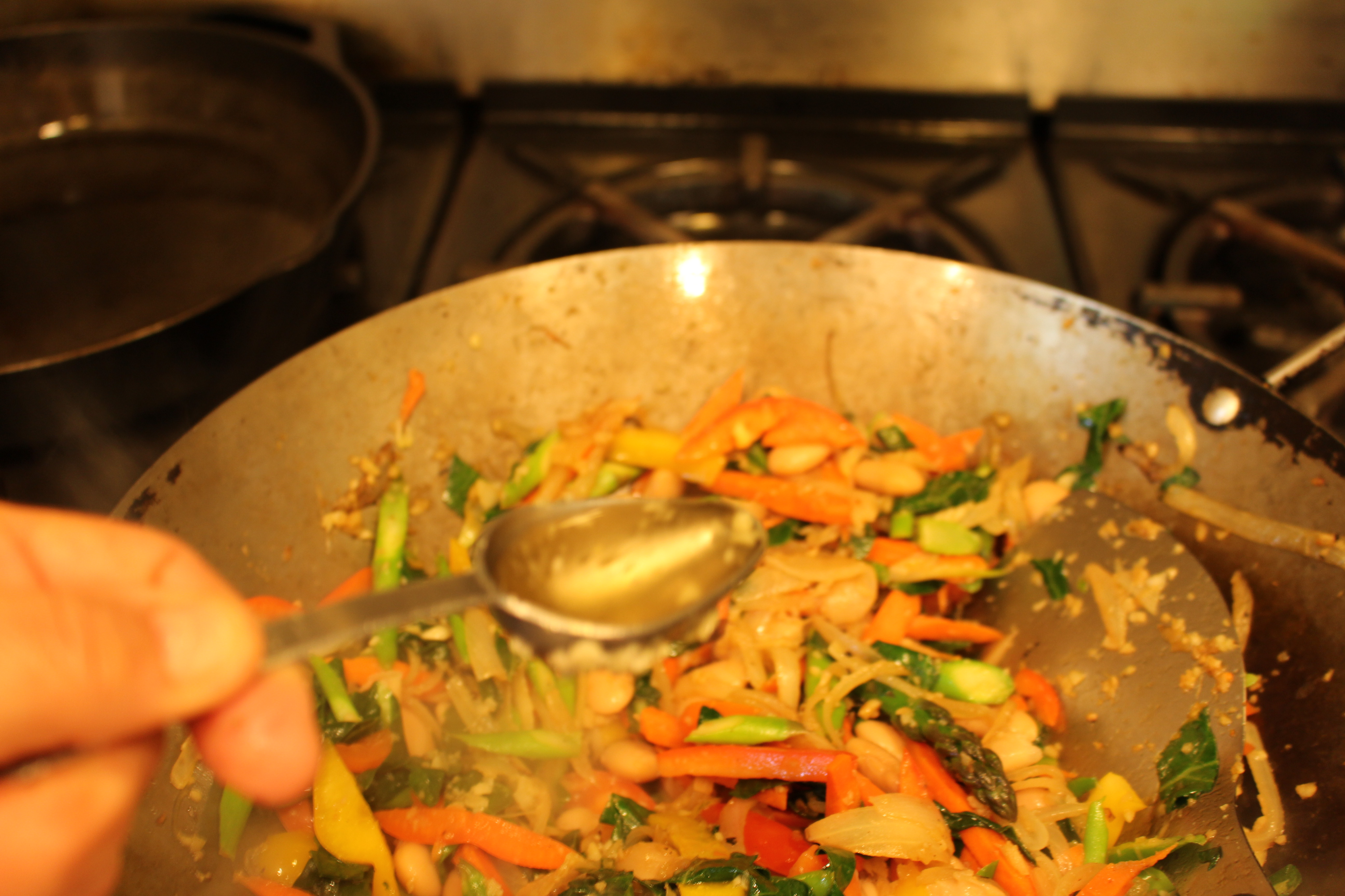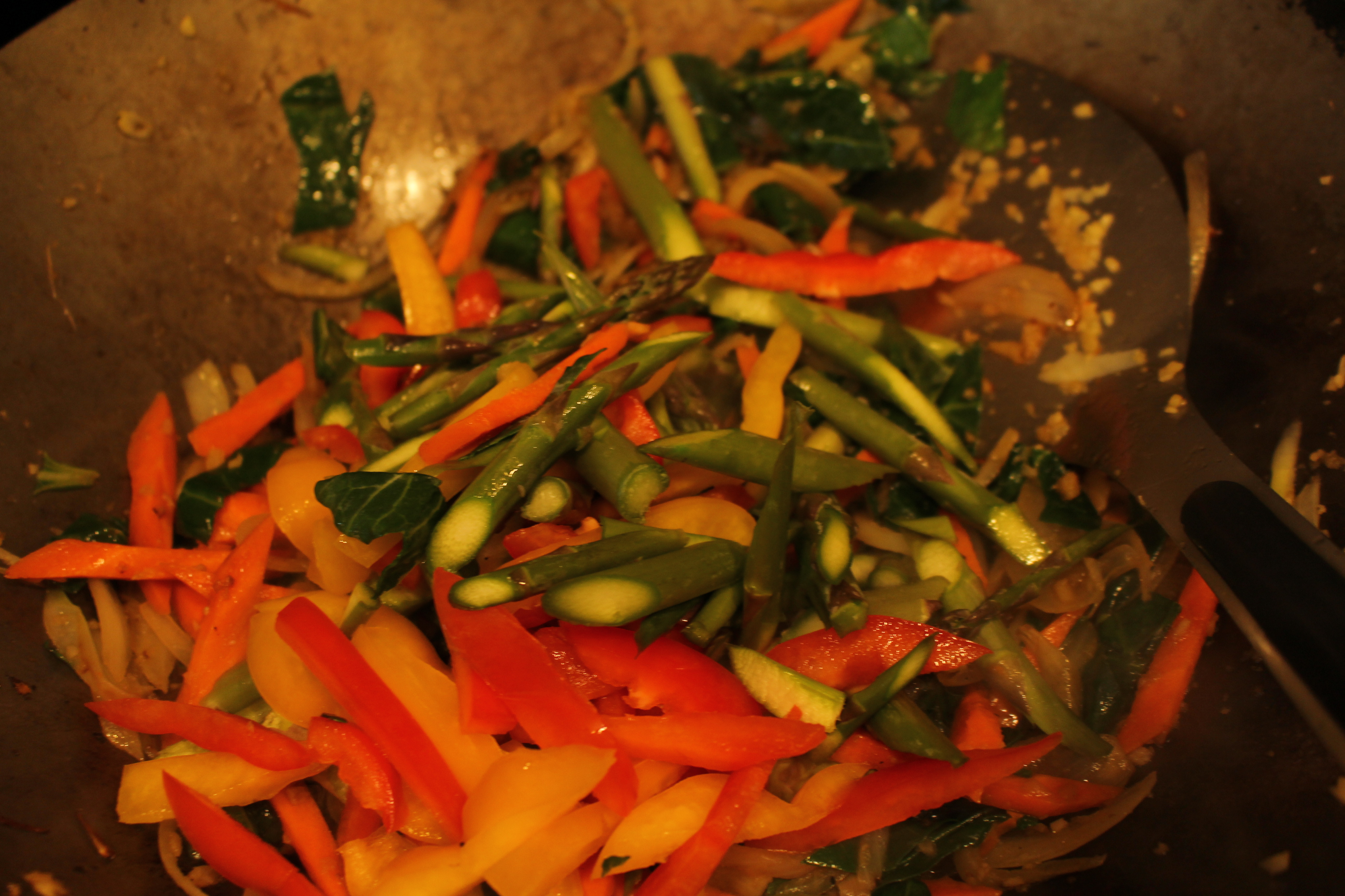 5. Add the asparagus and peppers, and cook a few minutes. Add the Aji Mirin, and the Tamari, and cook for a few more minutes.