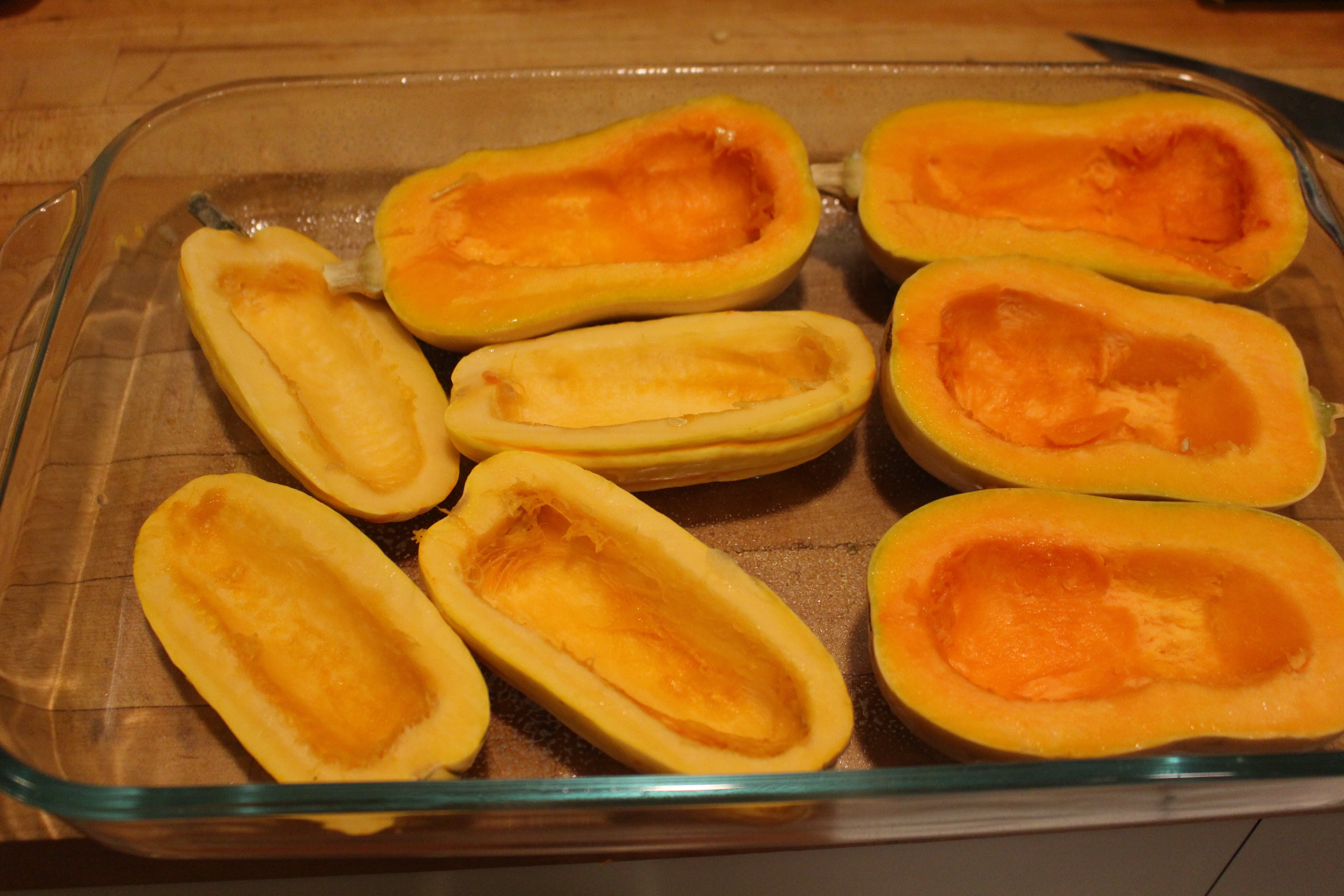 1. Cut squash in half lengthwise. Scoop out seeds, and some of the inside flesh. Place in pyrex pan with a little water. Cover with parchment paper and roast in 375 degree oven for 15-20 minutes. When soft, remove from oven and let cool.