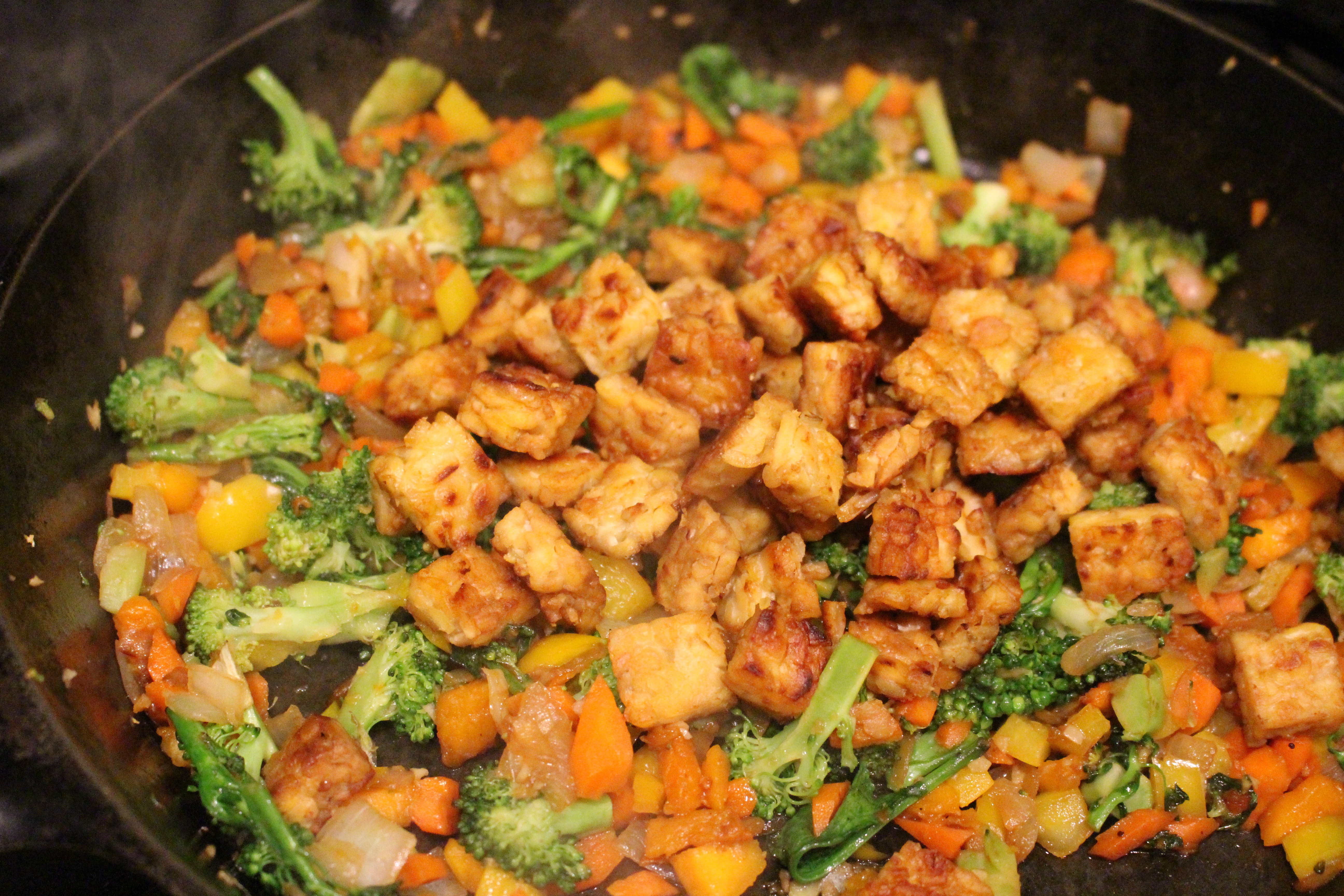 2. Meanwhile, in cast iron pan, sauté tempeh in olive oil till golden brown. Turn over each piece and sauté the other side until golden brown. Splash with tamari (about 1 Tbs) and remove from pan. Set aside.