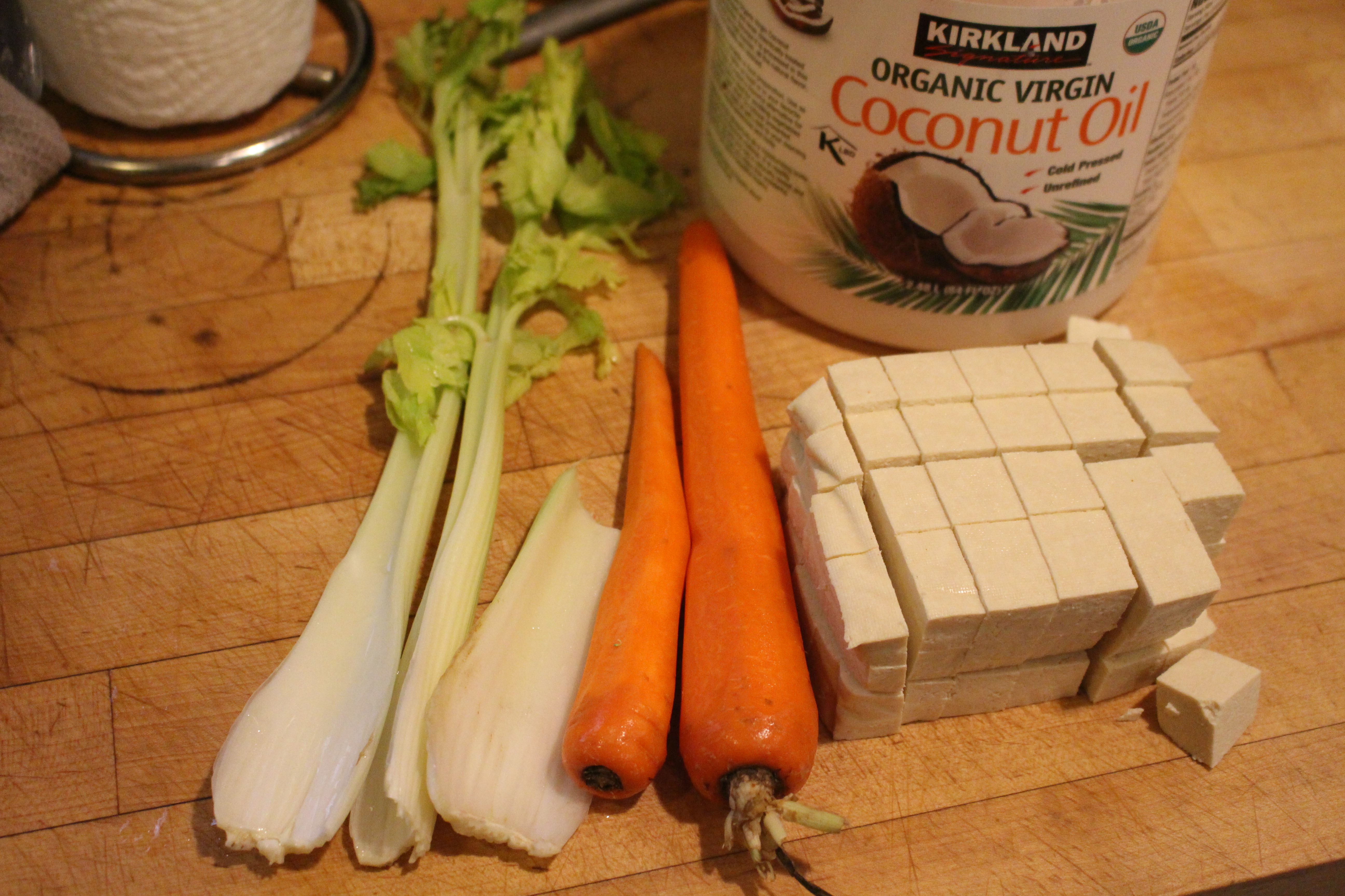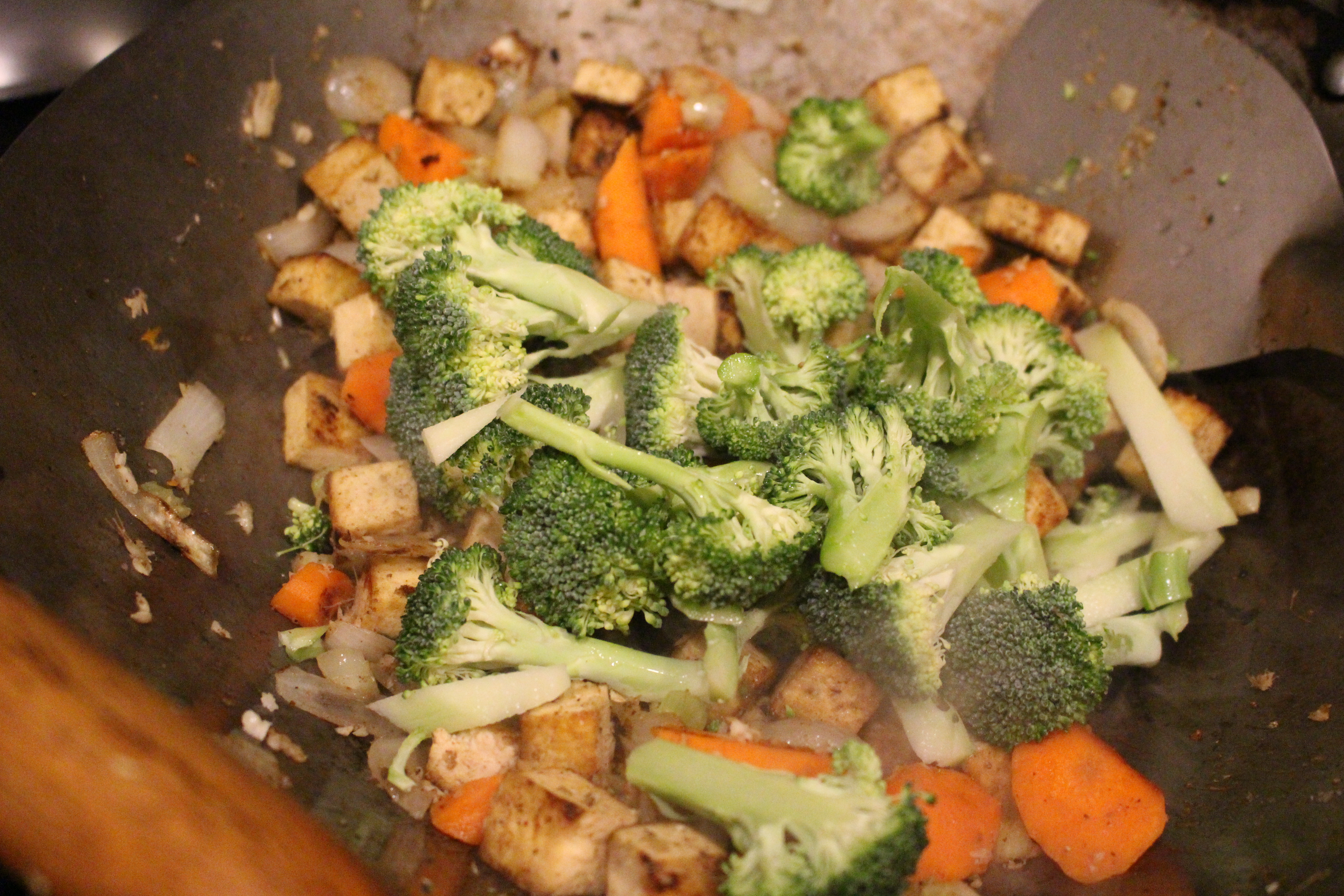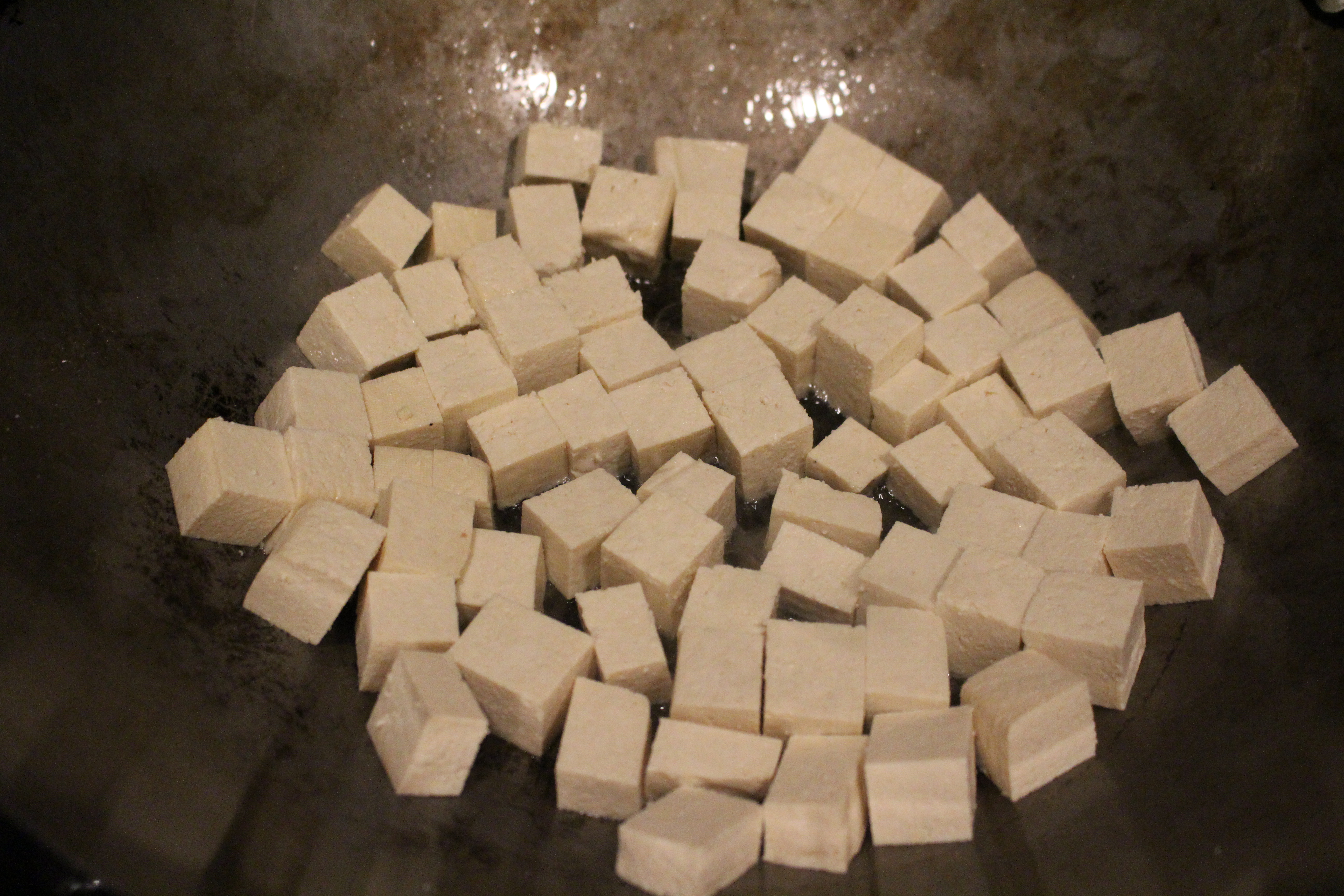 - Heat 1 Tbs. coconut oil in wok. When oil is hot, add the tofu, and sauté until golden brown on one side, turn over sauté other side.