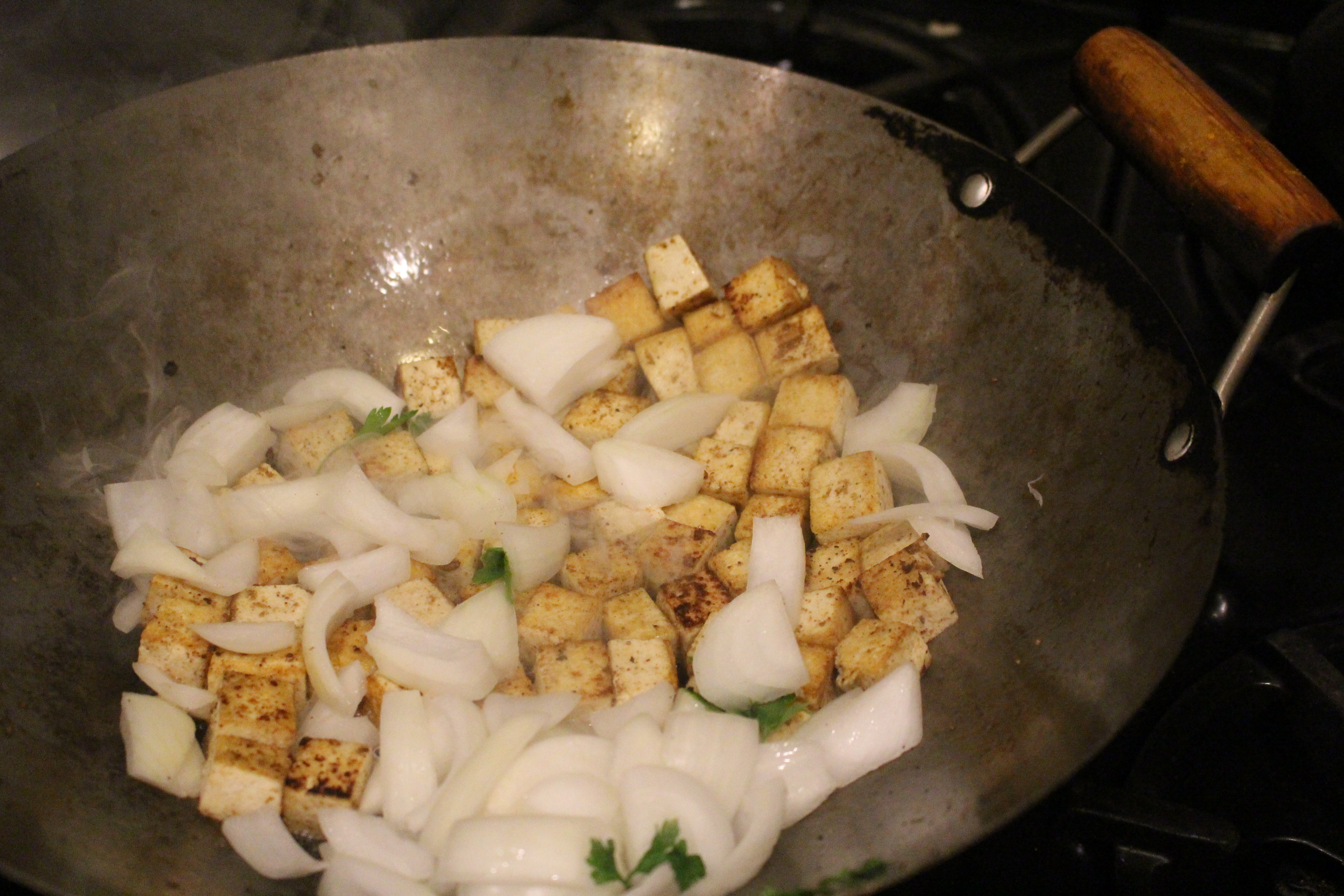 - Add the 2 t. of Khmeli Suneli to the tofu and cook for 3 minutes.