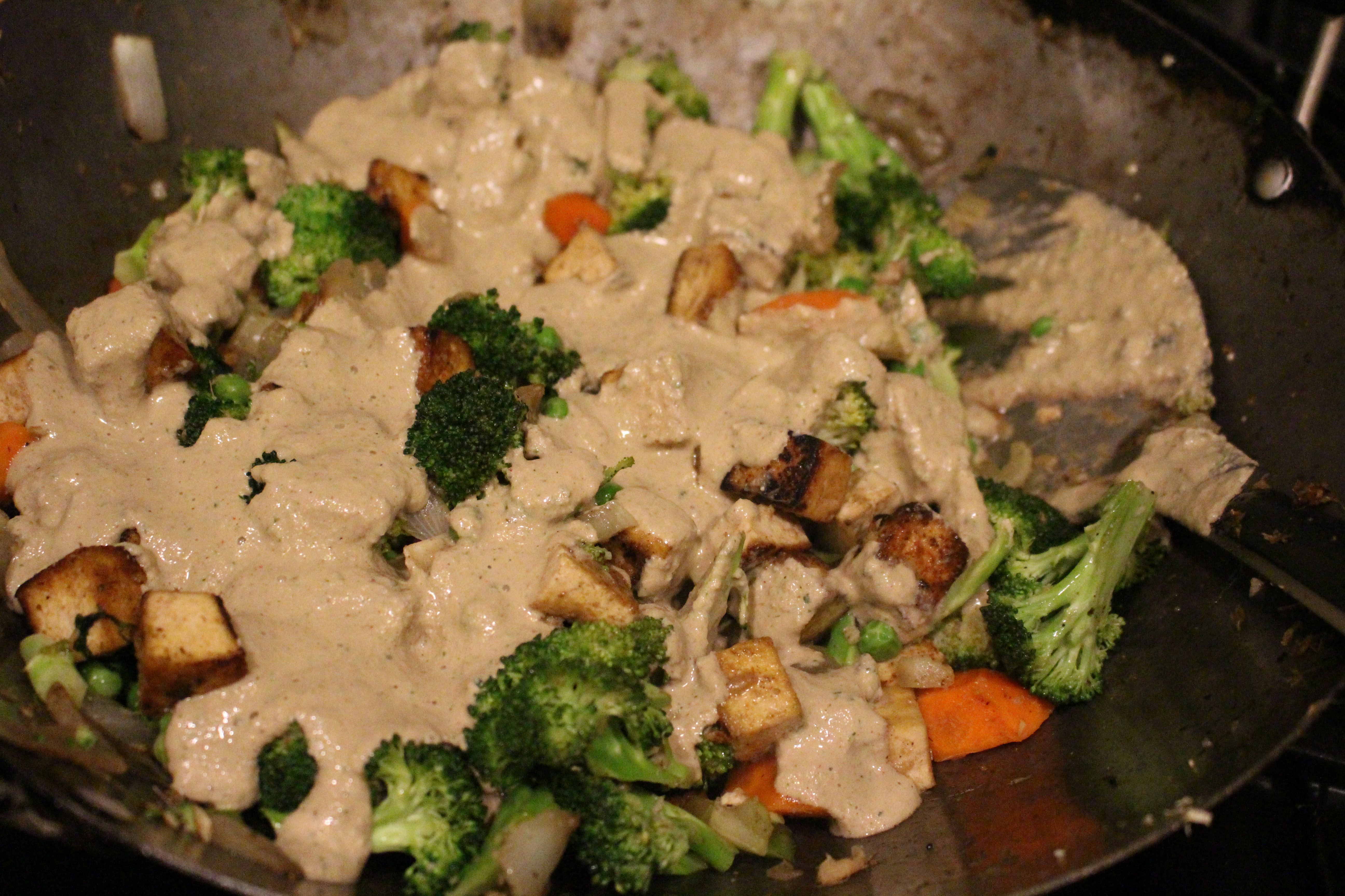 Pour sauce over tofu and vegetables, and serve with rice, noodles or potatoes.