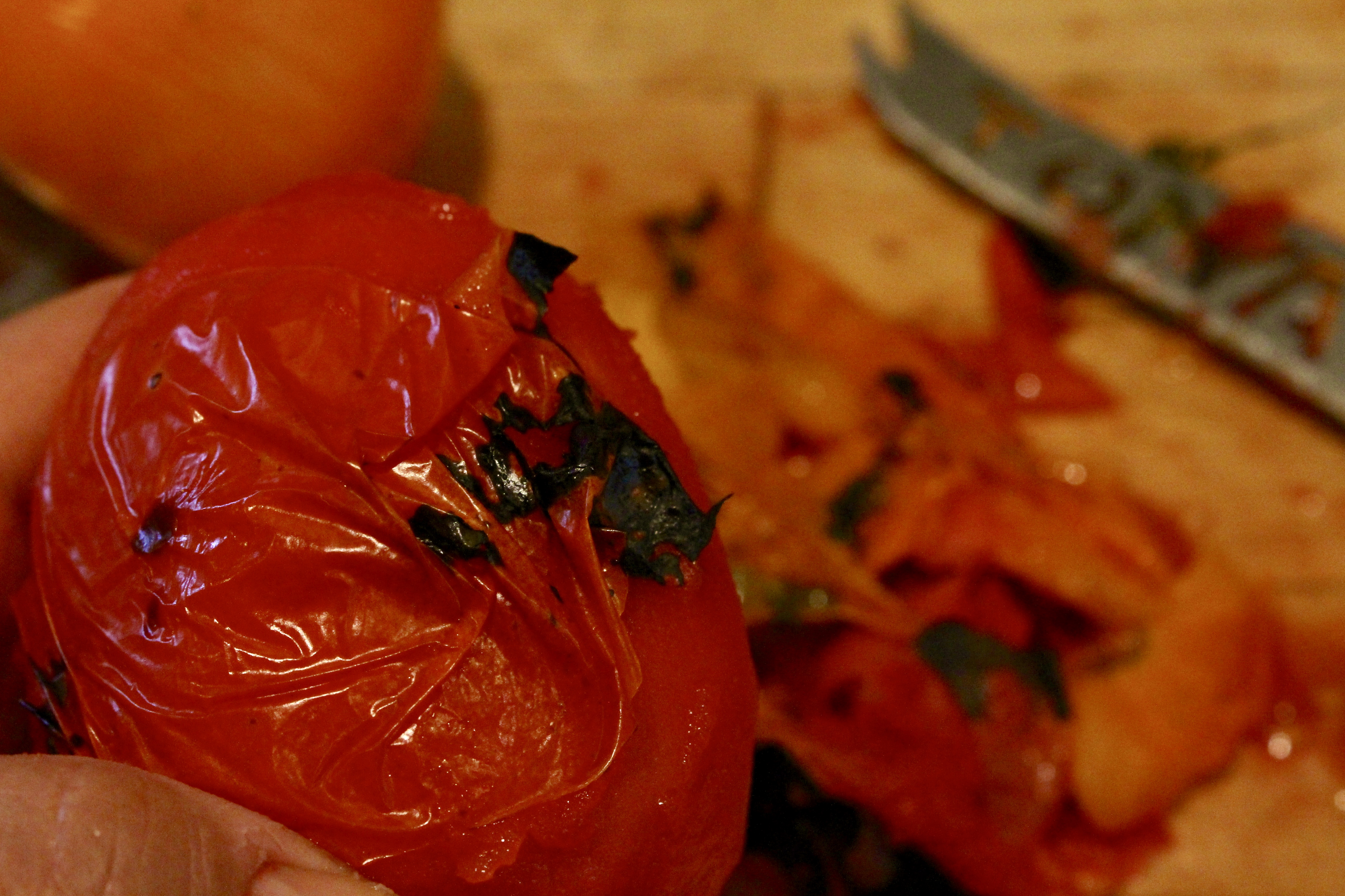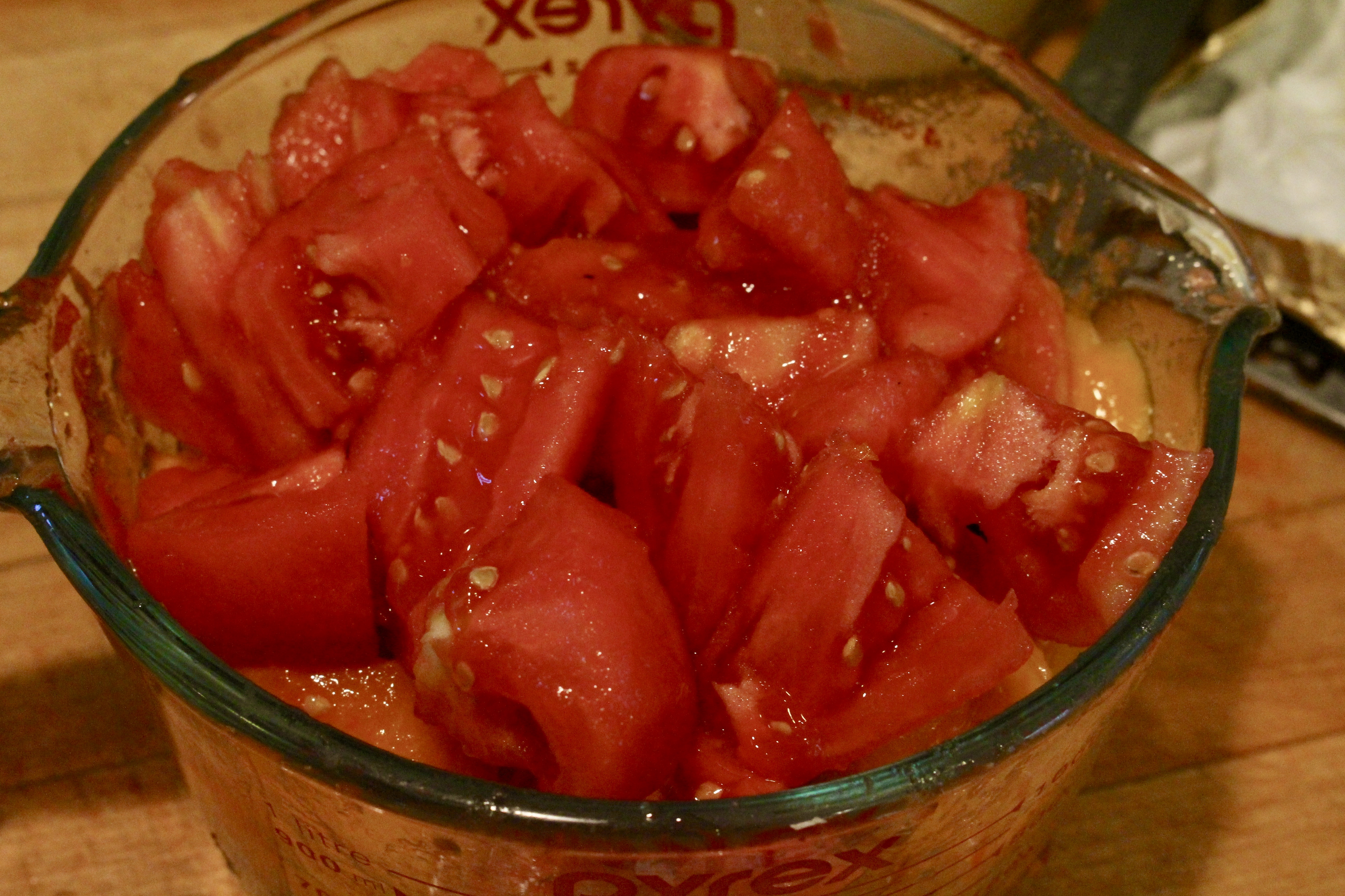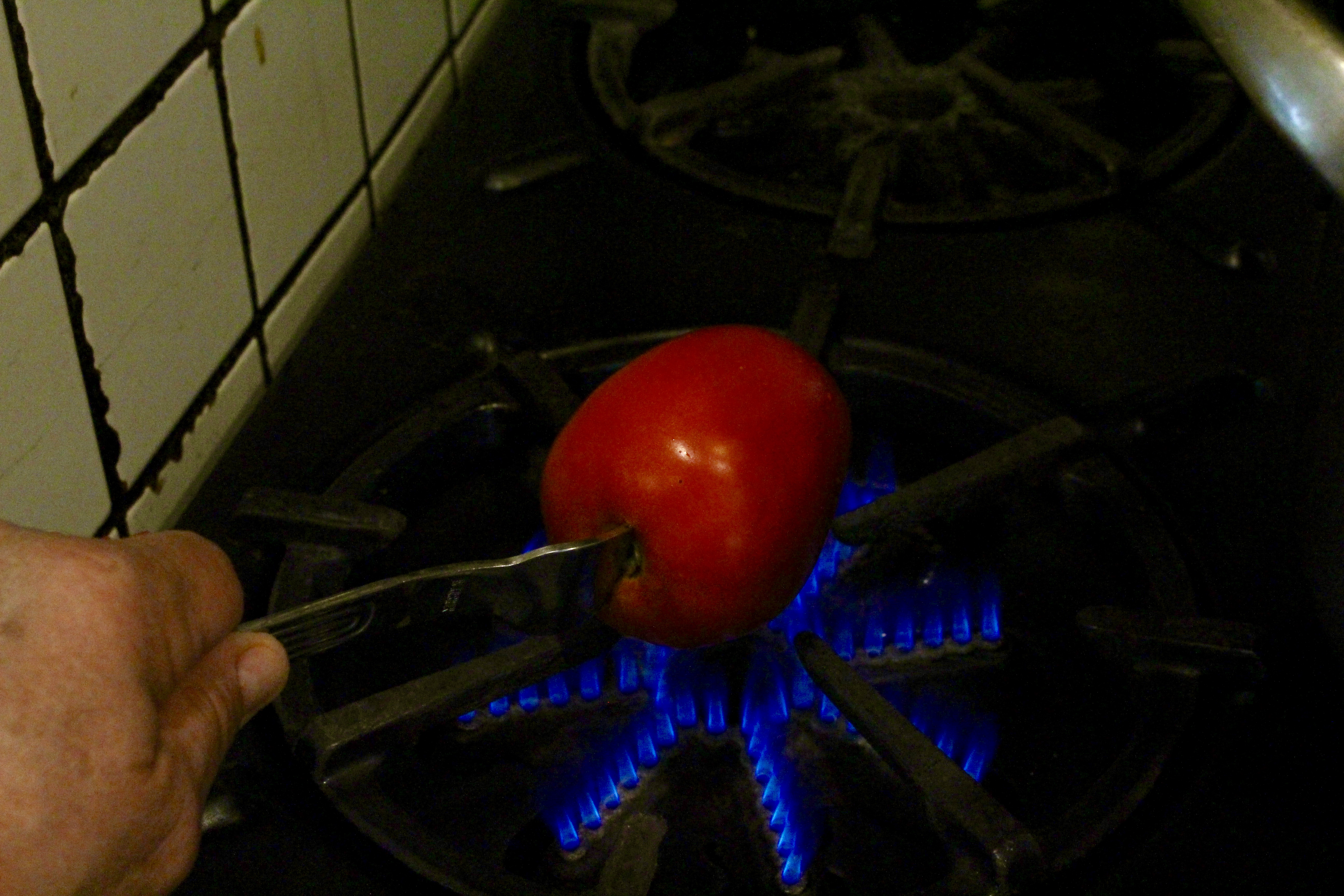 - Meanwhile, using a fork inserted into one end of a tomato, hold the tomato over a high flame, rotating it around, until the skin becomes charred. This will allow the tomato to be easily peeled. Once peeled, dice it up into large chunks. Continue with all of the tomatoes until you have 16 cups.