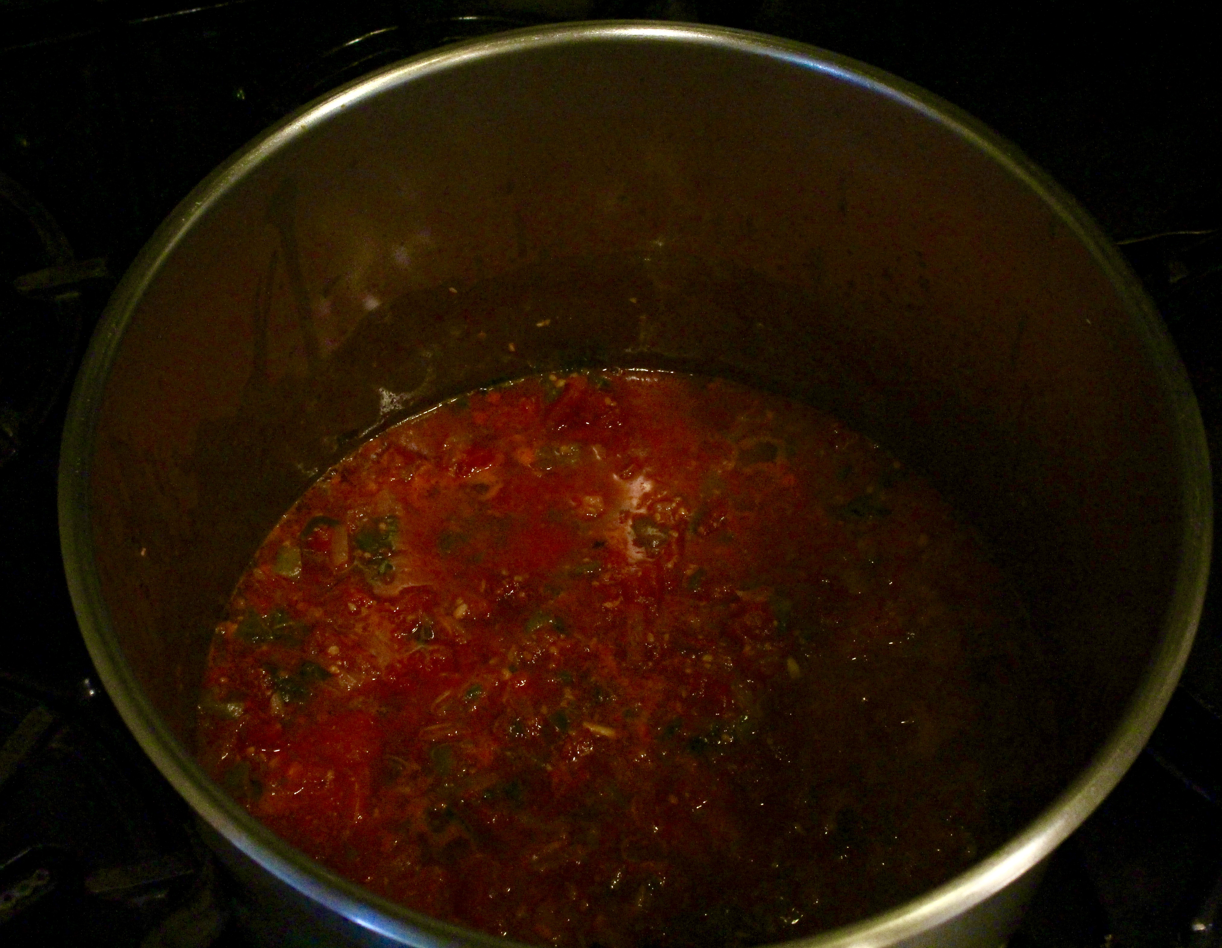 - Add the tomatoes to the pot, and let simmer for two hours, stirring occasionally, making sure it is not sticking to the pan.