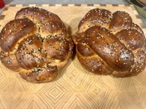 7. Divide dough in half. Using 1 half of the dough, cut into 3 pieces. Roll out each piece in to a long thread about 14” long. Braid the threads together to form the loaf. Repeat with other half. For the Jewish New Years, form the loaf into a circle.