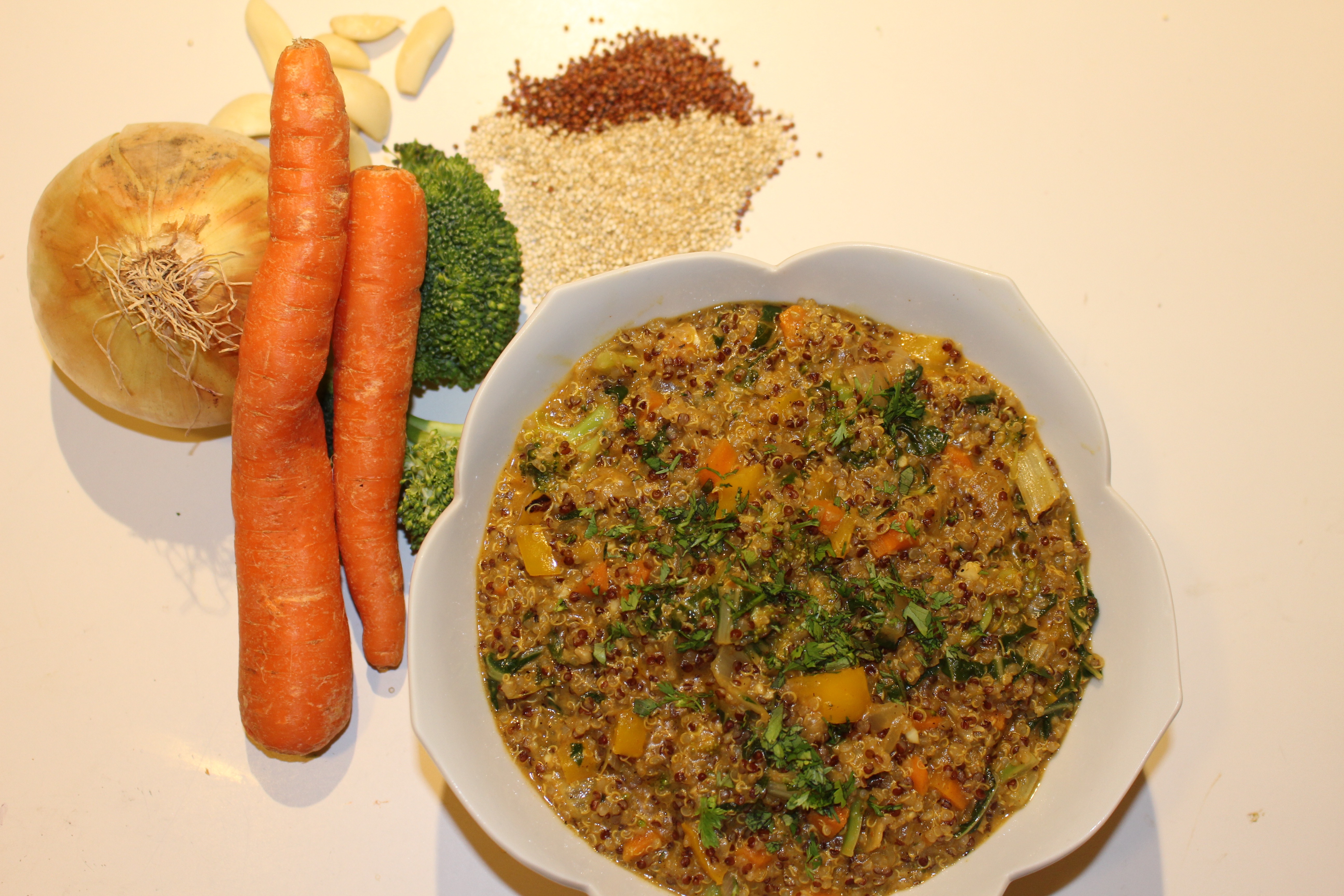 In a wok over medium heat, add the coconut oil. When hot, add the chopped onions, and cook until translucent. Add the carrots, garlic and ginger and cook for a few more minutes. Add the peppers and broccoli and continue cooking until soft. Add the bok choy and cook another 3 minutes. In a small bowl, mix the curry paste with the coconut milk, and then add to the wok. Add the curry powder, and salt and pepper. Add the cooked quinoa and continue cooking for another 10 minutes, stirring often, allowing the quinoa to absorb the coconut milk and curry flavor. Garnish with cilantro.