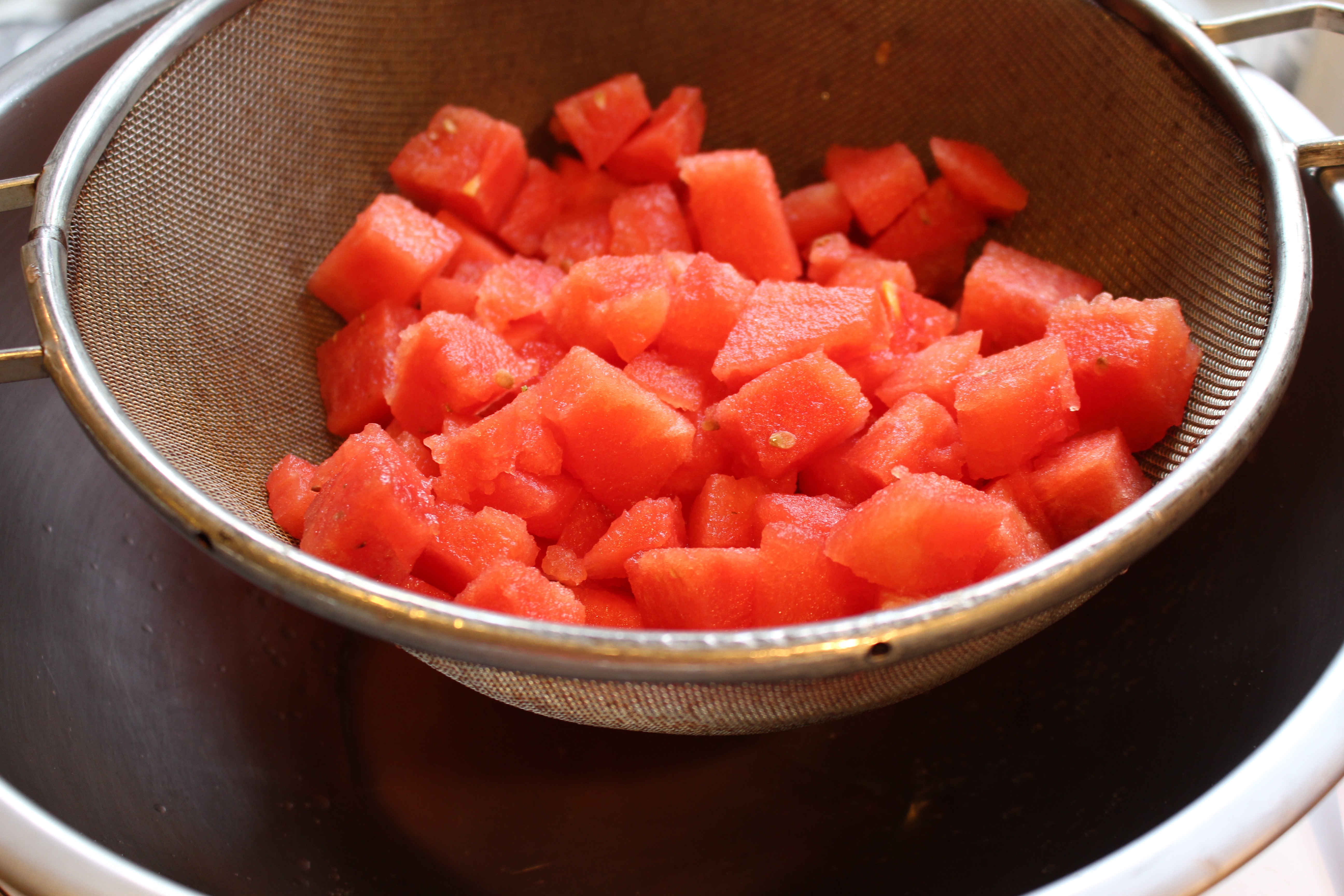- Cut up the watermelon into 1” cubes. Drain in colander for ½ hour with a bowl underneath (this way, you can drink the juice!)